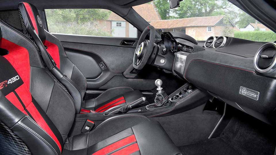 Like the exterior, the cabin of Evora GT430 also comes with exposed carbon fiber weaving. In addition, the lightweight racing seats, door sills and instrument binnacle are all made from lightweight carbon fiber. Available extras include the Sparco seats which are also made from carbon fiber and four-point harnesses with titanium rear frame. A mix of leather and Alcantara blankets the interior of the GT430.