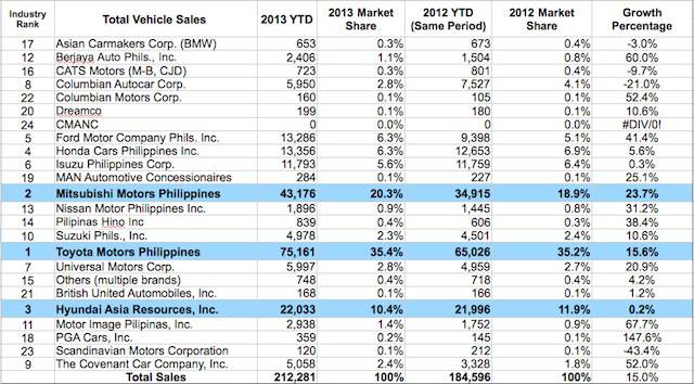 As it stands, Toyota Motor Philippines Corporation has a commanding lead of the Philippine auto industry in the number one spot. Over the course of 2013 and fueled by sales of the Toyota Vios, TMP was able to sell 75,161 units, a 15.6% jump from 2012's sales of 65,026 units. TMP now has a market share of 35.4%.