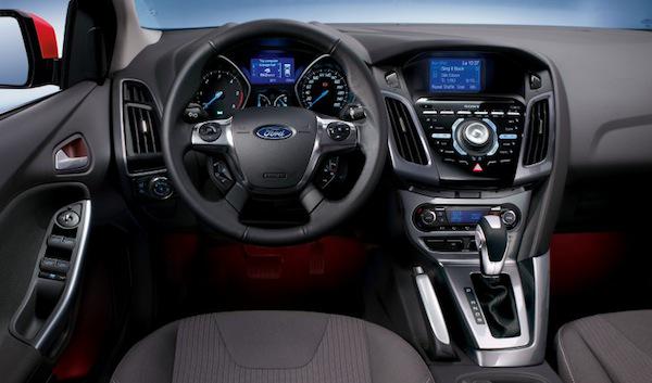 The interior shares more details and motifs in common with the current Ford Fiesta rather than the previous Focus. In front of the driver are a pair of gauges (speedo and tach) housed in a very modern, almost concept car-like binnacle, while the center console is dominated by an multi-function, multimedia audio system similar to the Fiesta. The climate control system's buttons are exactly the same as the outgoing model.