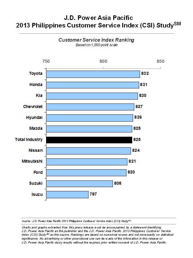 J.D. Power Asia Pacific has just released the results of the 2013 Philippines Customer Service Index (CSI) Study, rating the 11 of the major auto brands in the country with regards to customer service.