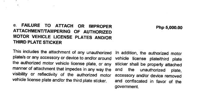 The blanket nature of the wording of Section II-e appears to cover anything that is attached to the license plate that was not authorized by the LTO, meaning third party accessories. This includes plate holders of any kind, plate covers or any other kind of accessory that “impedes in any way the visibility or reflectivity of the authorized motor vehicle license plate and/or the third plate sticker”. The inlcusion of the article is based on the Motor Vehicle License Plates Standization Program of the LTO which the agency issued in July of 2013.