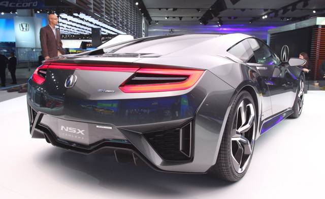 Acura announced a year ago that the Acura NSX will be powered by a mid-mounted, direct-injected V-6 engine mated to Acura's Sport Hybrid Super Handling All-Wheel Drive system. Sport Hybrid SH-AWD is an all-new, three-motor high-performance hybrid system that combines torque vectoring all-wheel drive with advanced hybrid efficiency through the use of three electric motors – one motor integrated with the V-6 engine and two motors driving the front wheels – along with an all-new dual-clutch transmission (DCT).