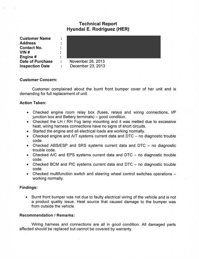After handing her car over to the dealership for inspection, the owner says that dealership/service center is (1) refusing to have her meet a representative from the distributor, Hyundai Asia Resources, Inc., (2) refusing to relay the official technical report from HARI, and (3) saying that the owner should claim the damage with her Santa Fe's insurance company.