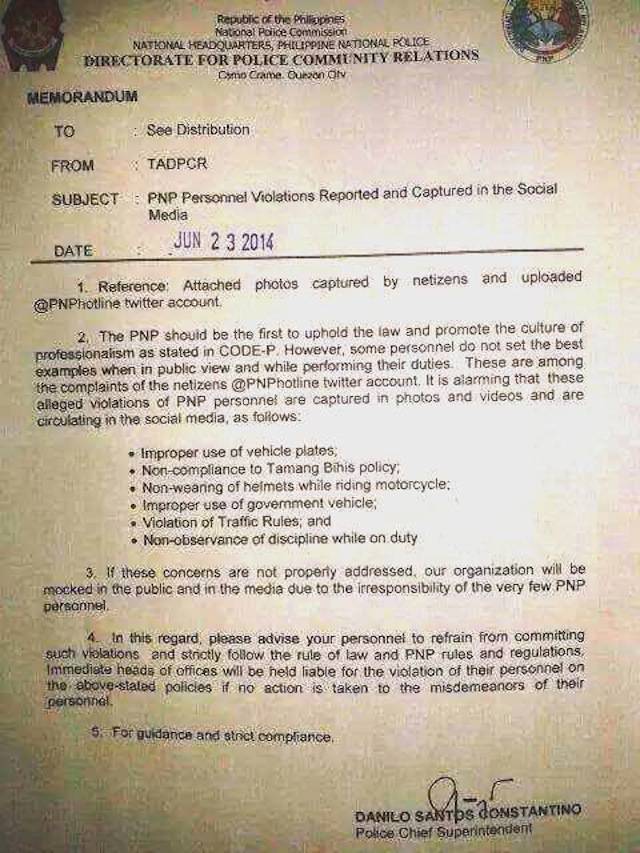 After repeated mockery on social media regarding duty officers violating traffic rules, the Philippine National Police's Directorate for Police Community Relations has issued a memorandum dated June 23, 2014 titled PNP Personnel Violations Reported and Captured in the Social Media.