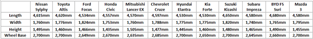 The 2014 Nissan Sylphy measures 4,615mm long, 1,760mm wide, and 1,495mm tall, with a wheelbase of 2,700mm. With this, we measure up the Sylphy against its primary competitors. Below is the size table of the different similarly-sized sedan models such as the Toyota Altis, Ford Focus, Honda Civic, Mitsubishi Lancer EX, Chevrolet Cruze, Hyundai Elantra, Kia Forte, Subaru Impreza, BYD F5, and the upcoming Mazda3.