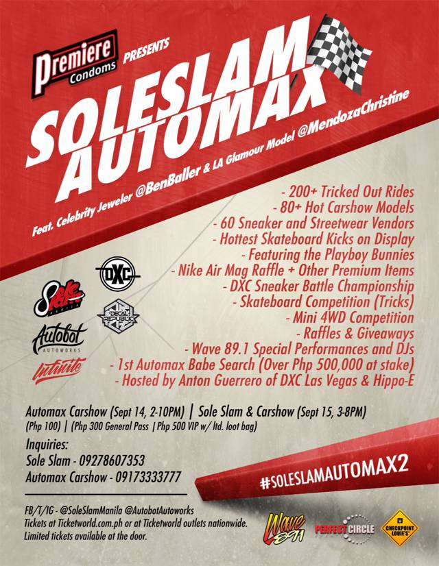 Tickets are available at all Ticketworld Outlets nationwide or at ticketworld.com.ph. For your inquiries, call 09278607353 for Sole Slam MNL and 09173333777for Automax Carshow.