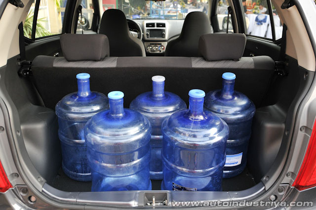Seating is quite comfortable for 5, though if you wish to fit 3 in the back, they shouldn't really be plus-sized. Legroom is good for all as the seats are also a bit more upright than, say, a Vios. Nevertheless, even with the rear bench up, the Wigo can fit 5 water dispenser bottles, each with a 5 gallon (18.9 liter) capacity with more space to spare. A reader asked if a bike can fit inside and the answer is yes, but not a full size one; some disassembly is required. Another asked what the spare tire was: yes, it's a full size spare and not one of those “donut” space savers.