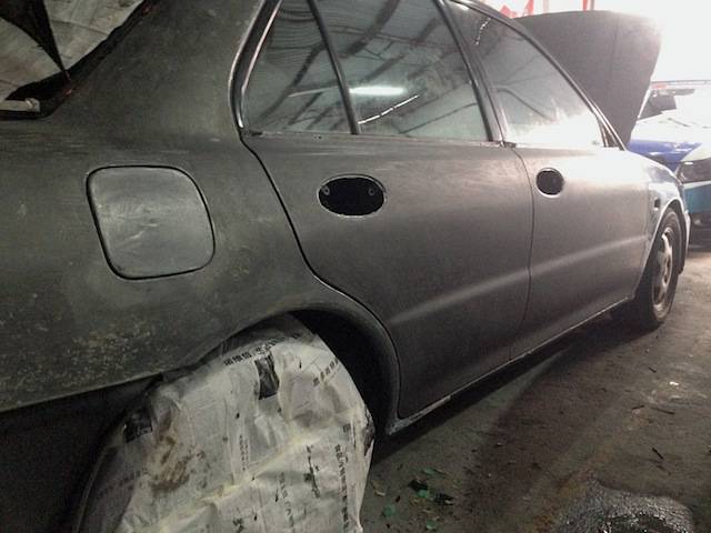 After removing the thick layers of primer meant that the bare metal of the shell was exposed for the first time in a long time. Being the second owner, it appears the car had undergone a collision repair before, as evidenced by the taps and bumps on the bare steel next to the fuel talk cap.
