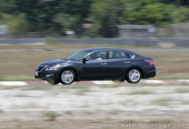Firing up that large V6 up ahead emits that signature growl of Nissan's VQ series engines; the same line of V6 motors found in Nissan's performance models like the 370Z and the R35 GT-R. At full throttle from a standstill the Altima squats down and applies as much power to the tarmac of Clark Speedway's main straight. The brakes work hard to scrub speed given the heavy executive saloon. Ditto for the suspension; it's best to remember this is a comfortable cruiser rather than a sport sedan.