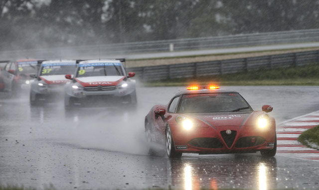 Continuous rainfall cancelled Race 2 of the 2014 World Touring Car Championship (WTCC) at the Slovakia Ring, right after Citroen's Sebastian Loeb and Jose Maria Lopez finished 1st and 2nd, respectively, in the soaked Race 1.